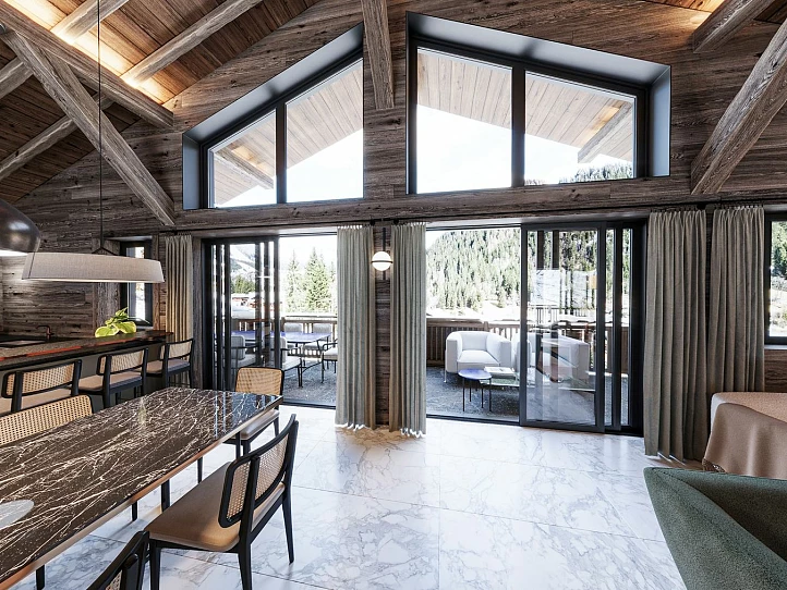 Conçu pour satisfaire les goûts les plus raffinés, cet hameau exclusif se compose de deux chalets indépendants et deux semi-chalets avec jardins et terrasses équipés de jacuzzis. S'intégrant parfaitement dans un cadre à couper le souffle, les propriétés seront construites dans un style alpin contemporain avec des matériaux nobles, mettant en valeur des éléments en bois vieilli, des cheminées, des plafonds cathédrale et de larges baies vitrées. Les deux semi-chalets offrent trois chambres plus une chambre avec lits superposés pour les enfants, tandis que les chalets individuels disposent de quatre ou cinq chambres et bénéficient d'un espace bien-être privatif.
