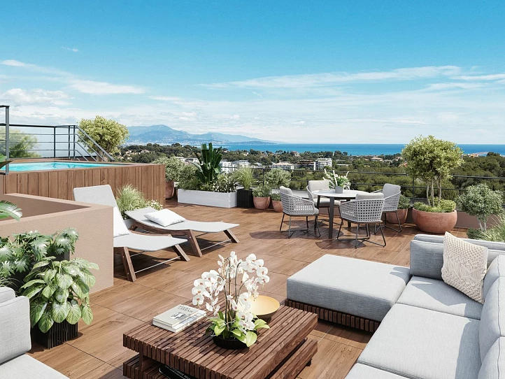 Conçu pour accueillir la lumière et le paysage, Vert Azur offre de généreux espaces de vie extérieurs, notamment des terrasses et des balcons qui prolongent les espaces de vie en plein air, parfaits pour profiter de la douceur du climat de la Riviera. Au dernier niveau, certains appartements penthouse de 4 pièces présentent de vastes terrasses solarium et des perspectives en hauteur qui invitent à des moments de contemplation paisible. La résidence est également dotée d'une piscine sur le toit, au milieu des pins, qui offre une oasis unique pour se détendre et se rencontrer.