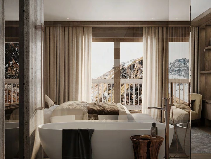 The interior design reflects a contemporary Alpine elegance, with a palette inspired by the natural surroundings and the use of materials that speak to the local heritage.