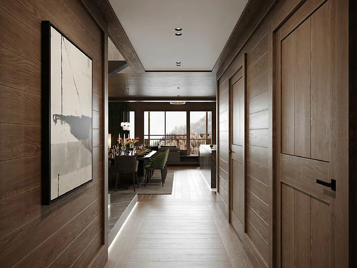 Crafted with precision, the use of local stone and noble wood accentuates the residence's warmth, while the balconies, framework, and facade beams exude an elegant architectural charm. The interiors, conceived in a modern, palatial Alpine style, afford ample natural light and generous balconies and terraces that present open views towards the Bellevarde face and the quaint old village.