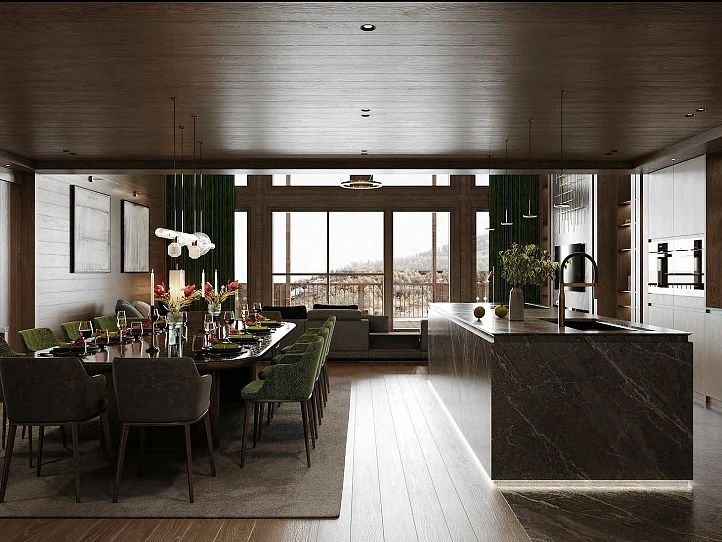 The duplex penthouse spans an impressive 287 sqm, comprising six bedrooms, each accompanied by en-suite bathrooms, ensuring privacy and tranquillity for all residents. The heart of this home is the 79 sqm living and dining area, which features a fully fitted kitchen, designed to cater to both intimate family dinners and lavish entertaining. The living room, with its double-height ceiling and expansive glass sliding doors, bathes the space in natural light and opens up to a 22 sqm terrace, inviting the outdoors in and offering unobstructed views of the mesmerising alpine panorama.
