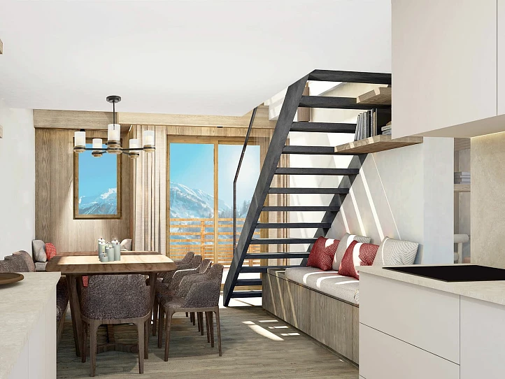 L'Ecrin is a stunning collection of 23 spacious apartments, paying homage to local architecture with traditional materials such as local stone, larch wood cladding, and slate roofing. Each apartment features large windows and exterior space with breathtaking views of Solaise, Fornet, and Col de l'Iseran. The interior design offers a choice between traditional Alpine or contemporary styles, and all residences are sold fully furnished and equipped. Perfect for families, nearly all apartments include a bunk bedroom. L'Ecrin also boasts elegant communal areas, including an igloo-inspired reception and a wellness area with a spa, gym, and swimming pool. Ski lockers, cellars, and parking are included.