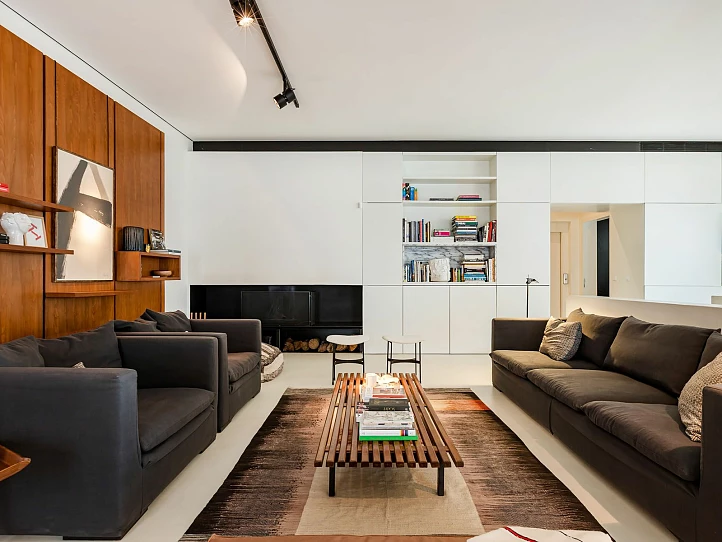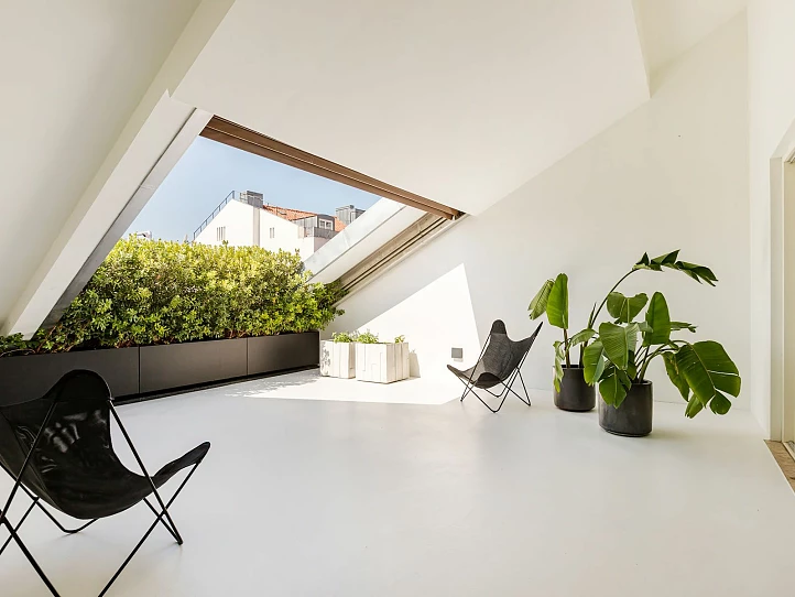 A suite principal ocupa um piso inteiro, combinando dimensões generosas, luz natural abundante e acesso ao exterior. Os elementos arquitetónicos de destaque incluem duas escadarias esculturais, linhas minimalistas e pormenores vintage criteriosamente selecionados que equilibram o design moderno com o carácter histórico do imóvel.