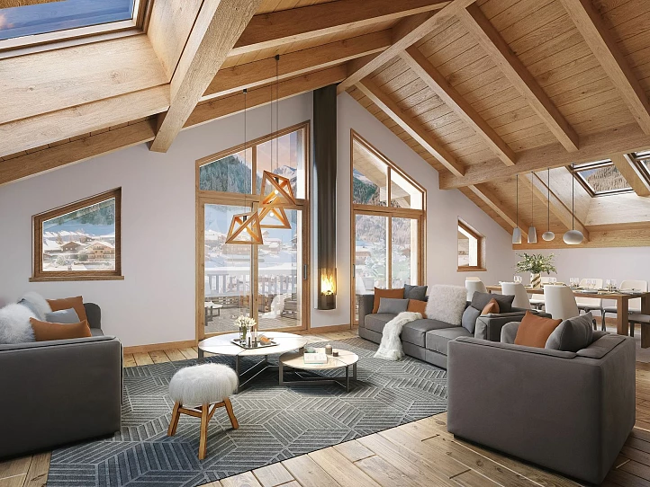 Denna exklusiva takvåning erbjuder generösa sällskapsytor med 3 sovrum, ett sovrum med våningssäng och en rymlig loftvåning som kan användas som kontor, lekrum eller extra sovrum. Vardagsrummet, med sitt imponerande 6 meter höga tak i katedralstil, öppnar upp mot en stor terrass med panoramautsikt från Pleney till Nantaux. Den alpinspirerade arkitekturen med stora balkonger och handsnidade räcken i trä förhöjer charmen, medan de påkostade materialvalen vittnar om hantverksskickligheten hos Morzines främsta byggmästare.