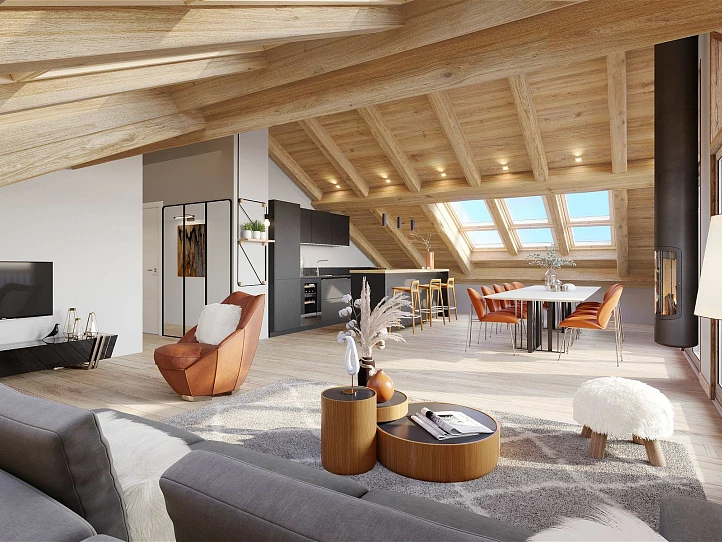 Denna duplex-takvåning på 144 kvm erbjuder generösa sällskapsytor med 3 sovrum, ett våningssängsrum och en rymlig loftvåning som kan användas som kontor, barnrum eller extra sovrum. Den öppna planlösningen på 65 kvm har en imponerande takhöjd på 6 meter med rustika trädetaljer och öppnar upp mot en stor terrass med fri utsikt över Super Morzine, Avoriaz och Morzines centrala torg. Chaletinspirerad arkitektur med stora balkonger och handsnidade räcken i trä förhöjer charmen, medan de exklusiva materialvalen vittnar om hantverksskickligheten hos Morzines största byggföretag.