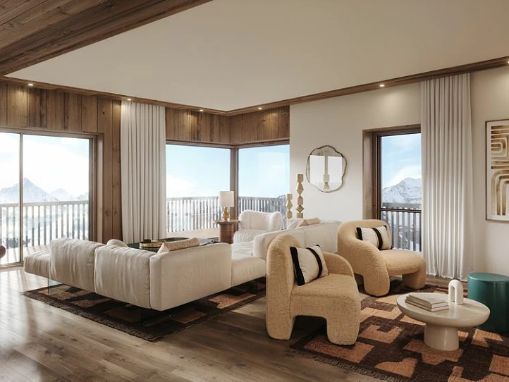 This new development features 27 luxurious apartments ranging from 42 to 147 sqm, designed to suit various needs, from cosy 1-bed + cabin options to expansive 5-bed + cabin residences. Each unit also includes large outdoor spaces, perfect for enjoying the panoramic mountain views. The property features a contemporary wellness area with a swimming pool, sauna, hammam, jacuzzi, and gym. Private ski lockers with direct slope access, cellars, and underground parking enhance the convenience and comfort of this prestigious residence.