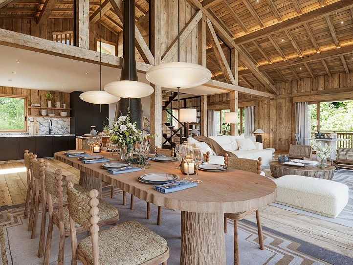 This project features two chalets, with the first chalet spanning 425 square metres. It includes six en-suite bedrooms, cathedral ceilings and an expansive open-plan living area that opens onto generous terraces offering breathtaking views of Le Jaillet. The property also boasts a private 667-square-metre plot with a landscaped garden and a traditional mazot. Designed with a blend of traditional Alpine architecture and contemporary features, the chalets feature standout amenities, including a swimming pool, jacuzzi, hammam, sauna, and cathedral-style living areas with double-height ceilings and expansive windows. Each property sits on a generous private plot — a rarity in the Alps — offering private gardens and even a mazot, which can be adapted into a spa, children’s playroom or storage.