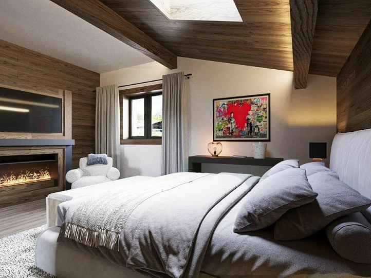 Both chalets offer expansive living spaces measuring 356 sqm and 180 sqm, and each is set on an independent plot of 790 sqm and 590 sqm respectively. The properties feature a south-west orientation, allowing for sun-filled interiors and expansive outdoor areas including large gardens and terraces. Each home includes 4 or 5 ensuite bedrooms, a spacious open-plan living area with cathedral ceilings and a cosy fireplace, plus a wellness area complete with a gym and spa. The chalets also provide ample parking for both you and your guests with 1-2 indoor garages and additional outdoor spots.