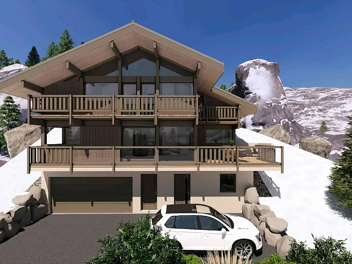 Spanning 181 sqm across three floors, with an additional 37 sqm internal garage for two cars, the chalet sits on a 575 sqm plot. It features five en-suite bedrooms, a spacious open-plan living and dining area opening onto a large terrace, and a bespoke kitchen with island and separate storage cellar. Wellness facilities include a sauna and gym with shower. A ski and boot room with secondary entrance enhances functionality, while construction is entrusted to a renowned chalet builder.