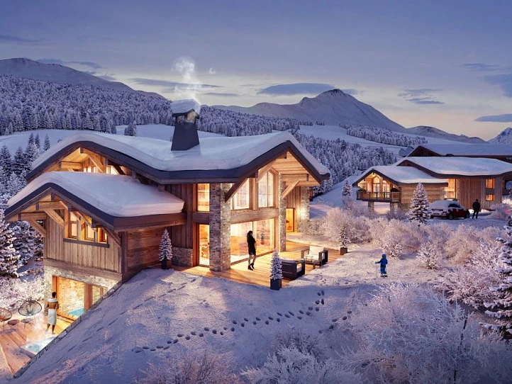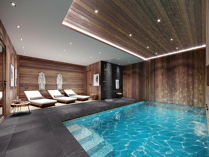 This family chalet spans 334 square metres and is thoughtfully designed to offer a modern lifestyle with a touch of alpine charm. An underground floor features a 2-car garage, a home cinema and ample storage space. On the lower ground floor you will find an indoor swimming pool, a gym, a ski room and two ensuite bedrooms. The ground floor is the main floor, with its spacious 108 sqm open-plan living area with double-height cathedral ceilings. The living room opens onto a large South-West facing terrace and the garden, offering open views towards Mont Chéry. An additional ensuite bedroom is also located on this level while you will find two ensuite bedrooms and a 14sqm mezzanine at the upper floor. The chalet is equipped with an elevator serving all floors, ensuring ease of access.