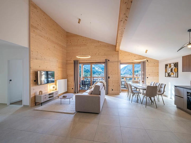 Designed for family living, each apartment comes with a fully-equipped kitchen and opens onto an outdoor living area overlooking either the village or the lower valley. Spacious and light thanks to an open-concept layout, all of the units come with additional storage space comprising both a ski room and a separate cellar. Underground parking spaces and garages are available within the residence at an additional cost.