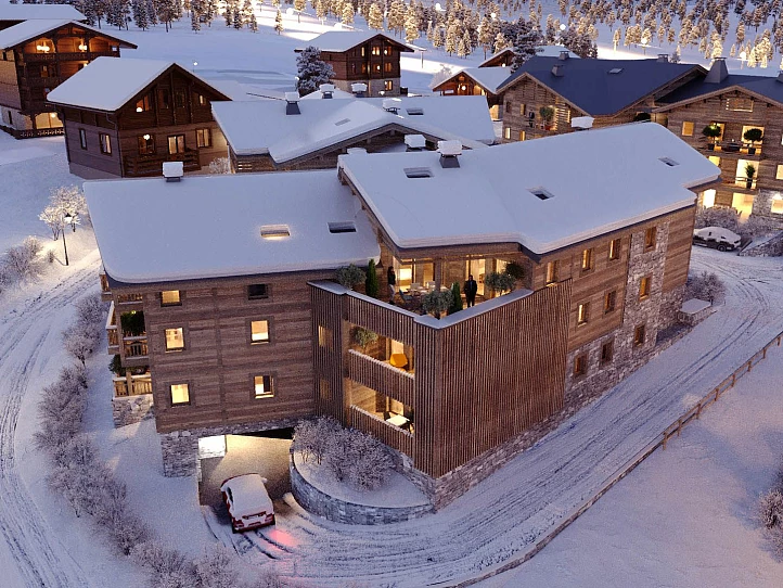 Hoani apartments blend traditional mountain chalet style with modern comfort. Perched on the mountainside, the building boasts a stunning exterior of local stone and naturally aged woodwork, complete with copper guttering. Inside, the well-appointed spaces range from 64m2 to 142m2, some of which are duplex apartments over two floors. Each apartment features underfloor heating, aged wooden beams and walls, oak parquet flooring, and fitted kitchens.