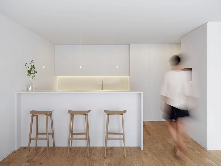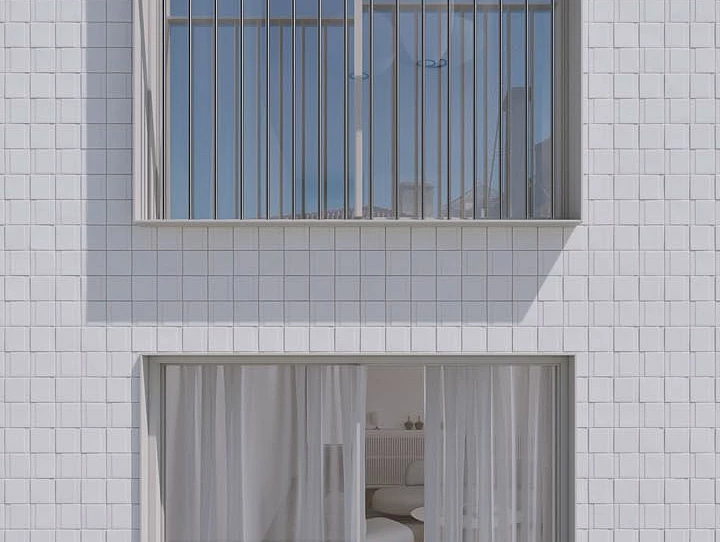 Set across four volumes, Páteo da Cordoaria comprises 16 apartments ranging from one to four bedrooms. The buildings are defined by clean architectural lines and a material language rooted in craft and quality. Interiors feature natural oak flooring, bespoke white-lacquered joinery and fully equipped kitchens with Corian worktops. Bathrooms are clad in Ataíja Azul stone and include floor heating. Viúva Lamego tiles grace the façades, reflecting light with subtle irregularity, while all units benefit from private underground parking and an electric vehicle charger.