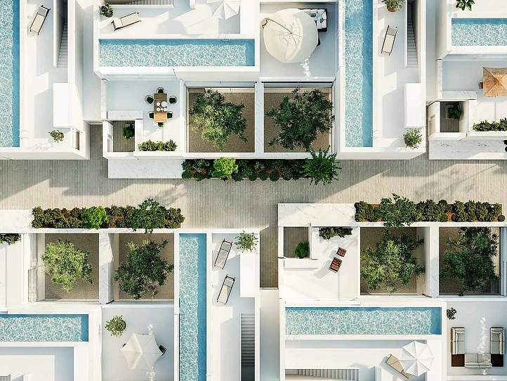Secret Garden Villas presents a unique blend of contemporary architecture and natural elements. With expansive floor-to-ceiling glass walls, each villa is designed to foster a sense of openness, drawing in the light and connecting the indoor spaces with private gardens and patios. The villas feature ample living spaces, private pools, underground parking, and a dedicated elevator for easy access to all levels. With just 11 residences, this is an exclusive community designed for comfort and privacy.