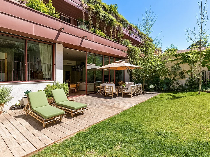 In this exceptional three-bedroom duplex apartment, clean lines, industrial details, and biophilic design seamlessly merge with lush green spaces crafted by a renowned architecture studio. The spacious living and dining area, featuring four-meter-high ceilings, effortlessly connects to a 242 sqm garden with a swimming pool, creating a peaceful retreat in the city. Complete with a fully equipped kitchen, pantry, laundry area, and two parking spaces, this property offers residents a perfect blend of luxury and practicality.