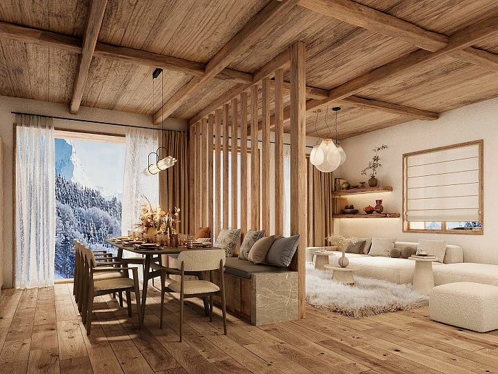 Esta coleção exclusiva de apartamentos com 1 a 4 quartos — cada um com 1 a 3 quartos adicionais com beliches — oferece um requintado conforto de montanha, valorizado por terraços extra grandes e vistas deslumbrantes a partir dos pisos superiores. Duas penthouses duplex coroam os níveis de topo, com impressionantes tetos de catedral de 5 metros e terraços panorâmicos. Todas as habitações incluem estacionamento subterrâneo, cacifos para esquis e acesso a uma generosa área de bem-estar com piscina interior, hammam, sauna e ginásio. Os interiores apresentam acabamentos de padrão excecional.