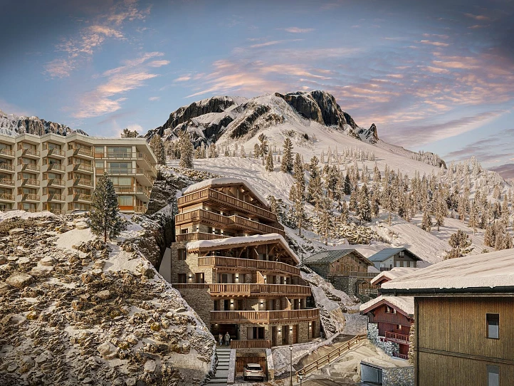 Set in a prime south-facing position on the sunny side of Val d’Isère, this new-build residence combines breathtaking panoramic views with exceptional on-site amenities. Just a short walk from the village centre and the snow front, the development features traditional Alpine architecture, generous outdoor spaces, and a variety of spacious layouts. Crafted by the Alps’ leading developer, with high-end finishes throughout, this is mountain living at its most refined.