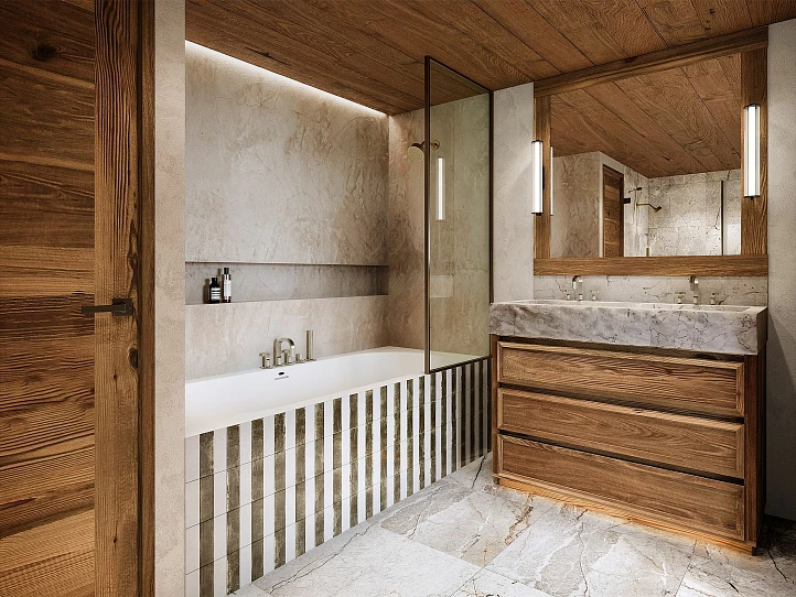 Fasaden renoveras av en välrenommerad lokal byggaktör och kommer att harmoniera med omgivningen, medan interiören renoveras i en varm alpin stil med åldrat trä, parkettgolv och stora fönster för att maximera det naturliga ljusinsläppet.